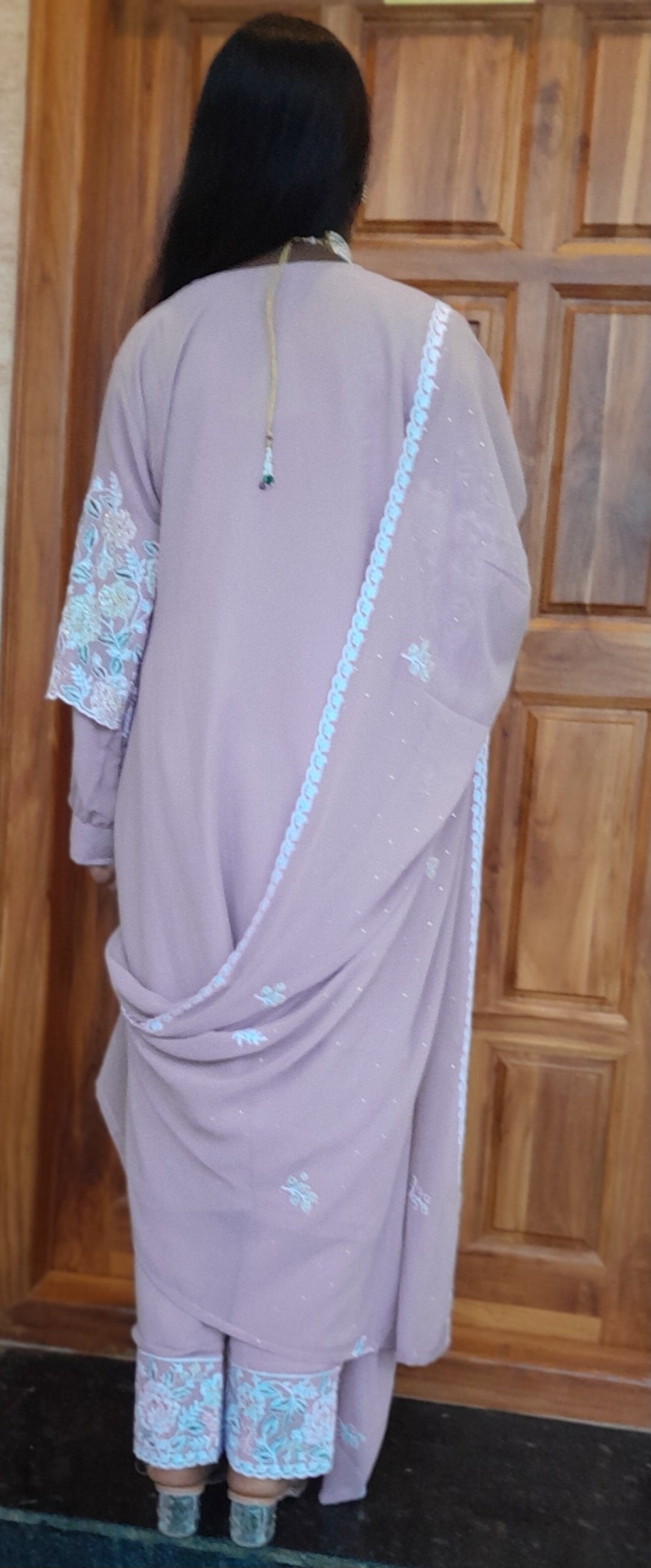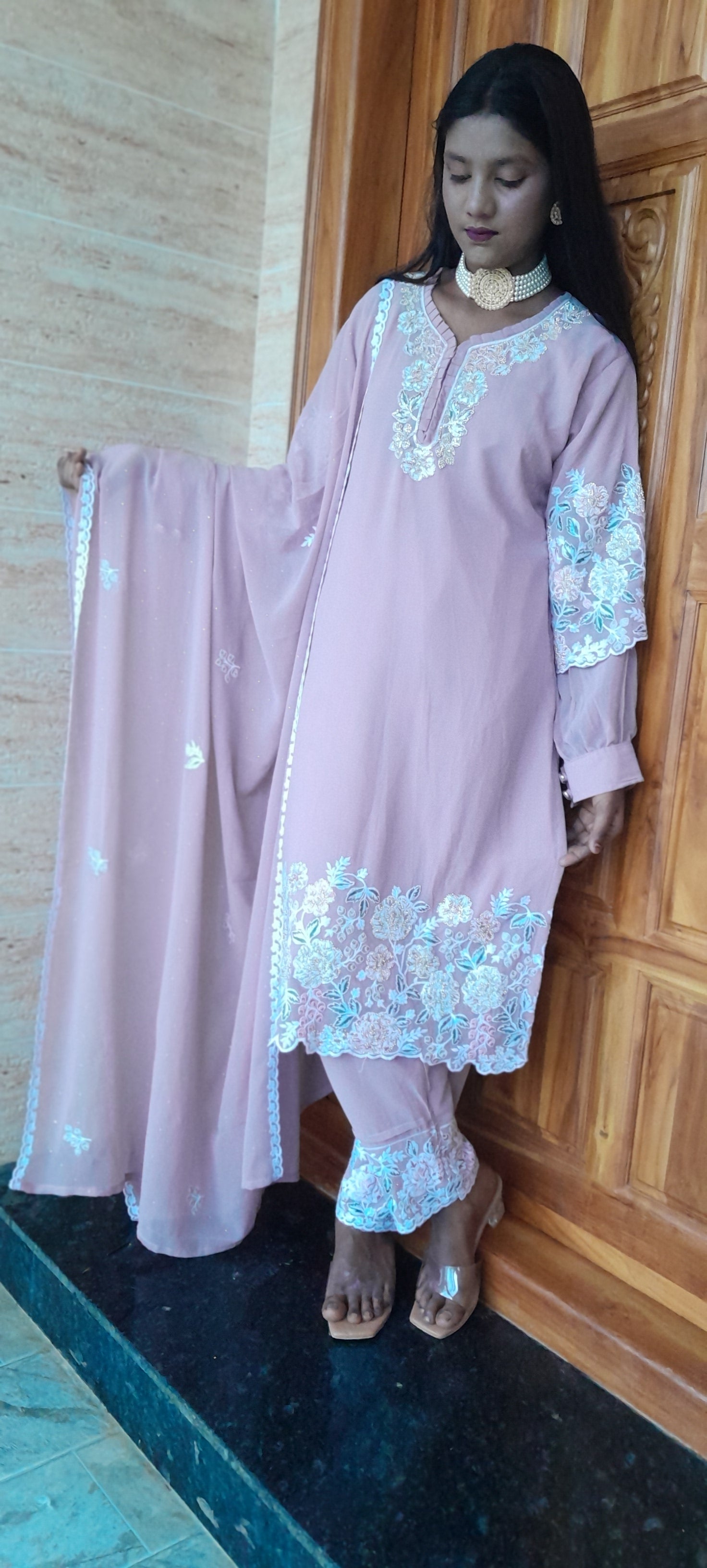 Presenting an exclusive powder pink Pakistani-style suit, a premium single-piece ensemble crafted for women who appreciate elegance and refinement. Designed with double different sleeves for a unique contemporary touch, the suit features intricate floral embroidery and comes with a matching full dupatta for a complete, luxurious look. With its soft hue, graceful silhouette, and meticulous detailing, this piece is perfect for festive occasions, intimate celebrations, or special events—a timeless addition to a curated wardrobe.